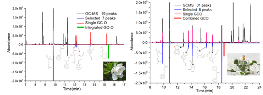 对栀子花鲜花样品和某茉莉花香水样品中有嗅闻信号的组分进行在线筛选和组合后,通过嗅闻仪进行混合成分感官分析,成功模拟了原有样品的香气(香气特征重合度分别达到了90%和85%以上)。